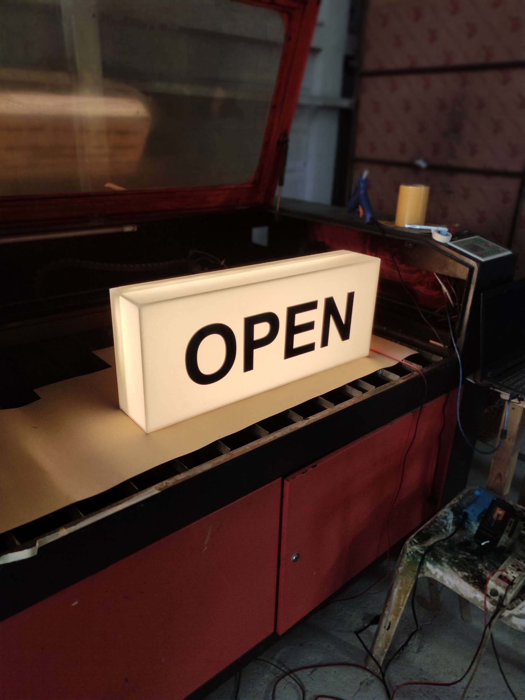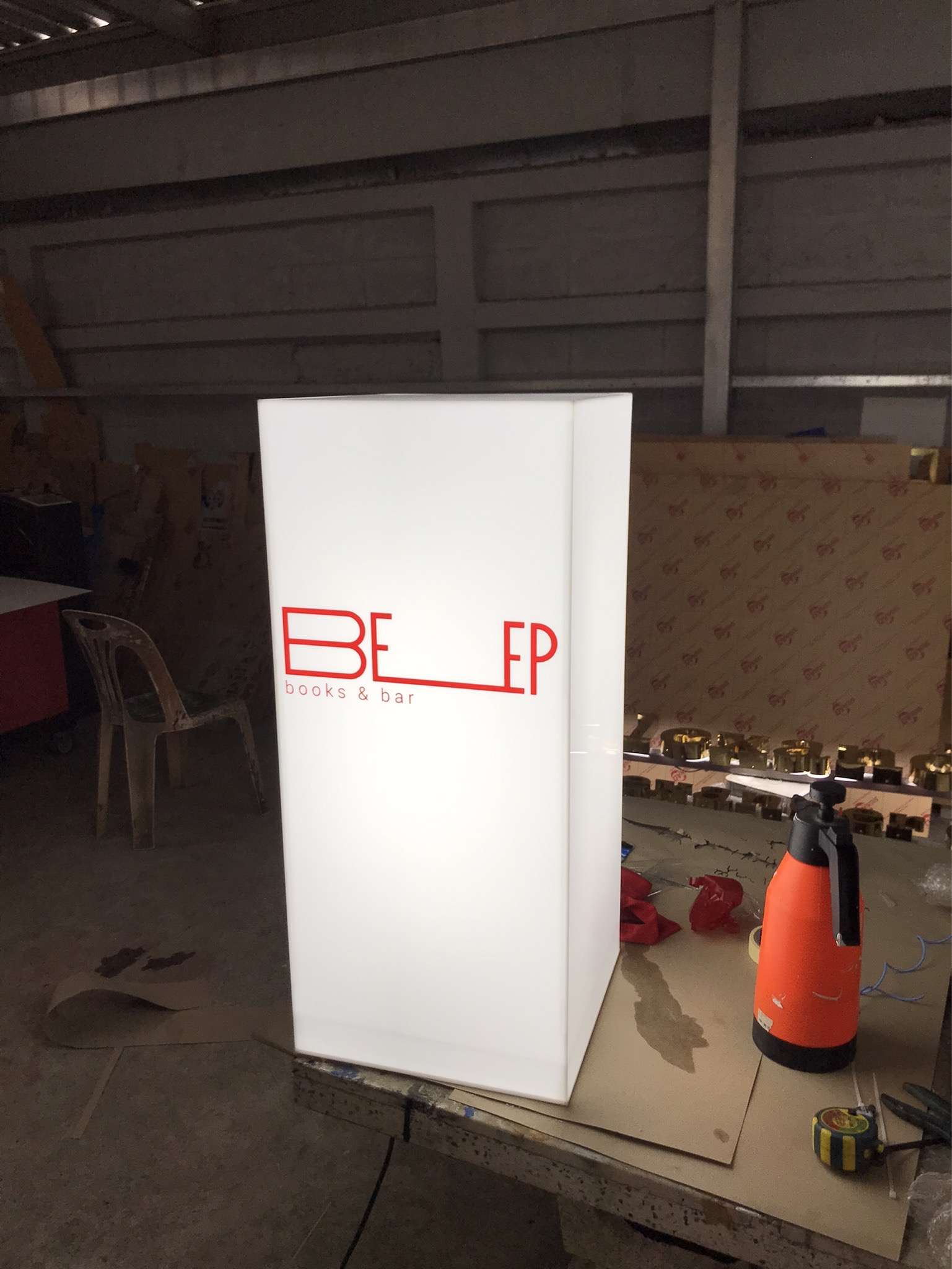 โดยวัสดุที่ใช้ผลิตจะเป็นวัสดุซิงค์ และโลหะเพื่อทำโครงป้าย ผสมผสาน กับวัสดุอะคริลิคเพื่อให้แสงสามารถลอดผ่านตัวป้ายได้ ประกอบเป็นงานป้ายกล่องไฟ (LIGHTBOX)